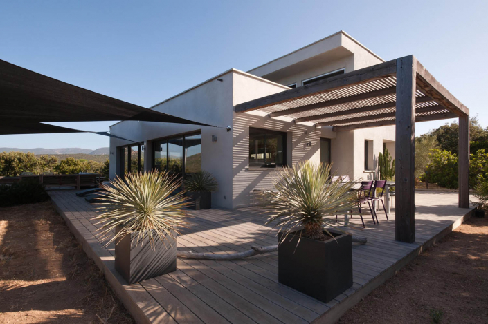 En Corse, la côte de l’extrême sud ouest est restée largement préservée du développement touristique. La villa Cervi y est née, sur une terre marquée des vents dominants. Dans cet univers sauvage, l’architecture s’exprime dans un langage cubique, tel un hommage à l’Hôtel « Nord sud » d’André Lurçat ( Calvi 1929 ).
